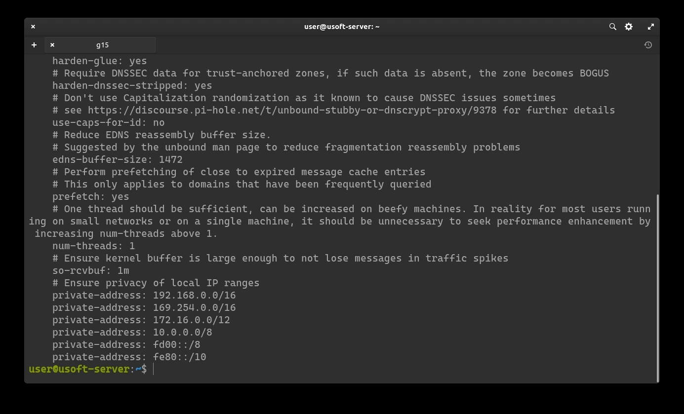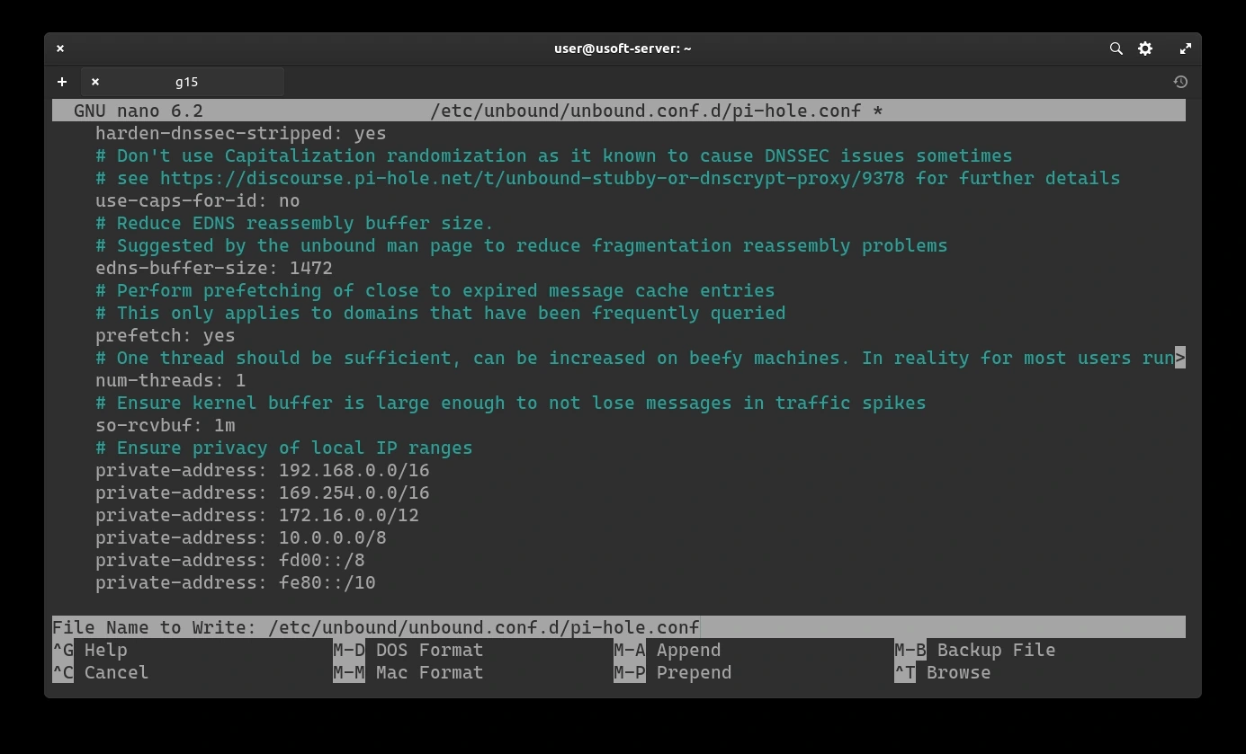 To be sure that the file has been saved correctly, copy the following command sudo cat /etc/unbound/unbound.conf.d/pi-hole.conf and press Enter to execute it.