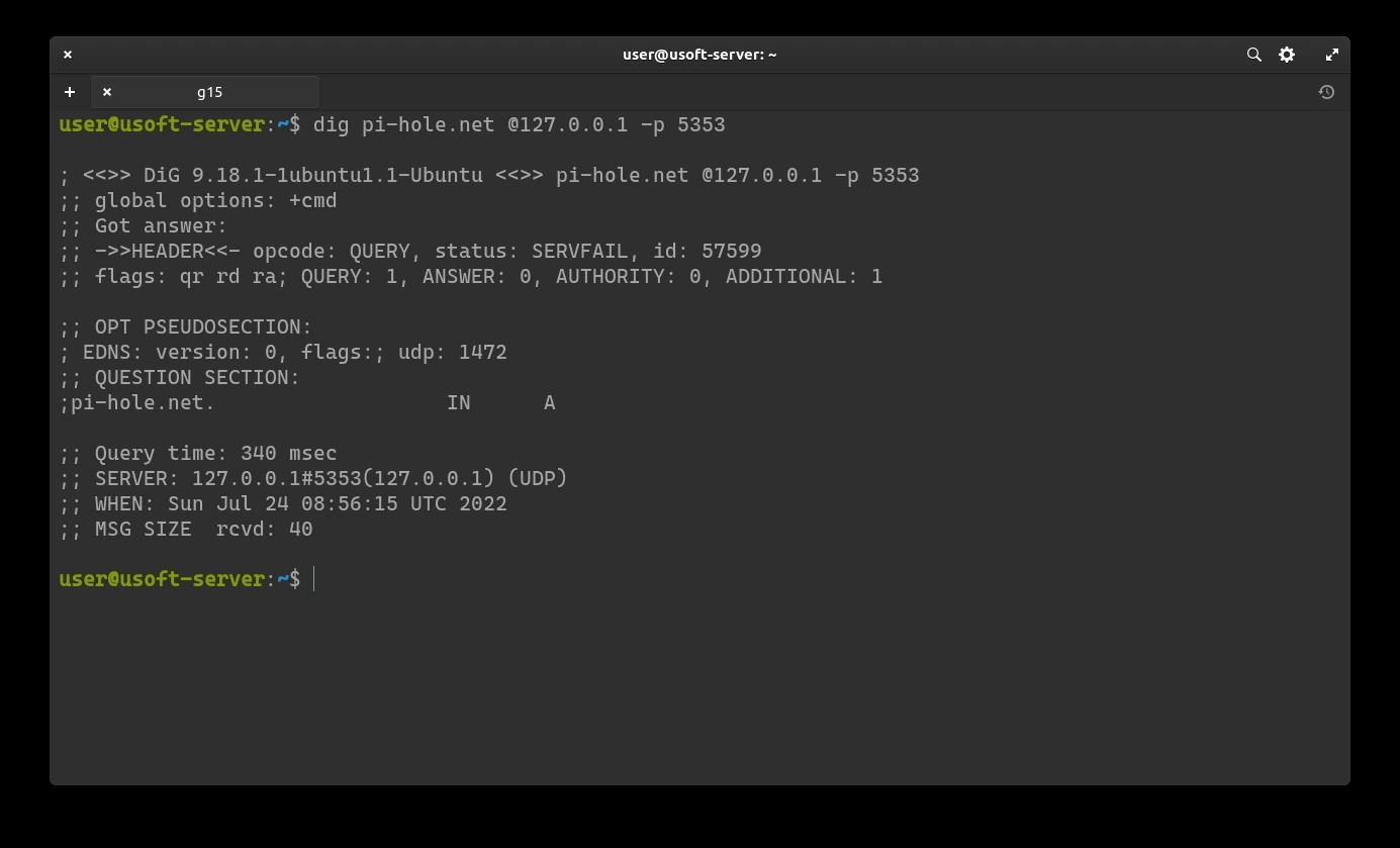 First command: dig pi-hole.net @127.0.0.1 -p 5353