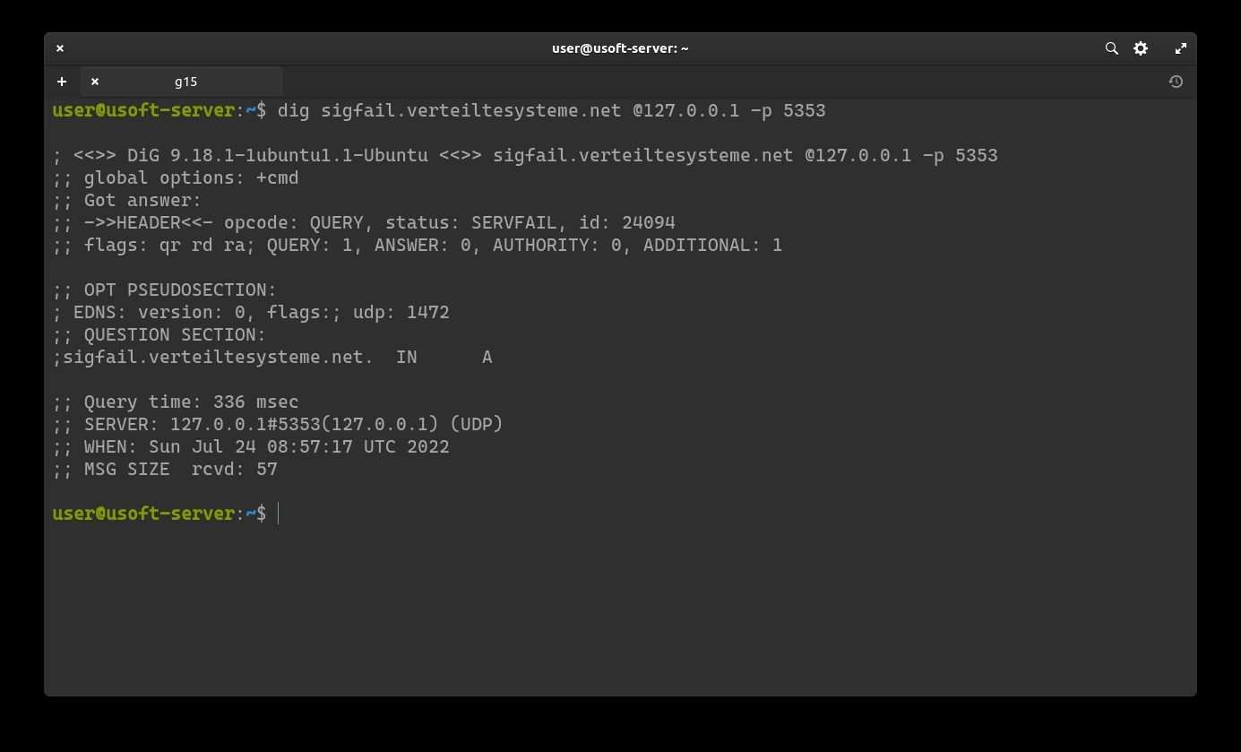 The following command should return SERVFAIL without any IP address: dig sigfail.verteiltesysteme.net @127.0.0.1 -p 5353.