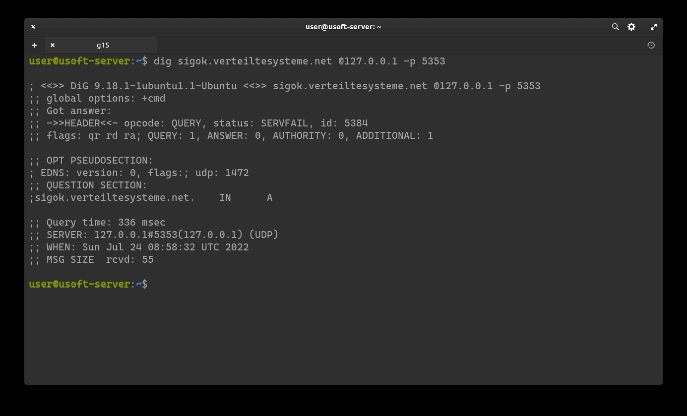 This command should return NOERROR with an IP address: dig sigok.verteiltesysteme.net @127.0.0.1 -p 5353.