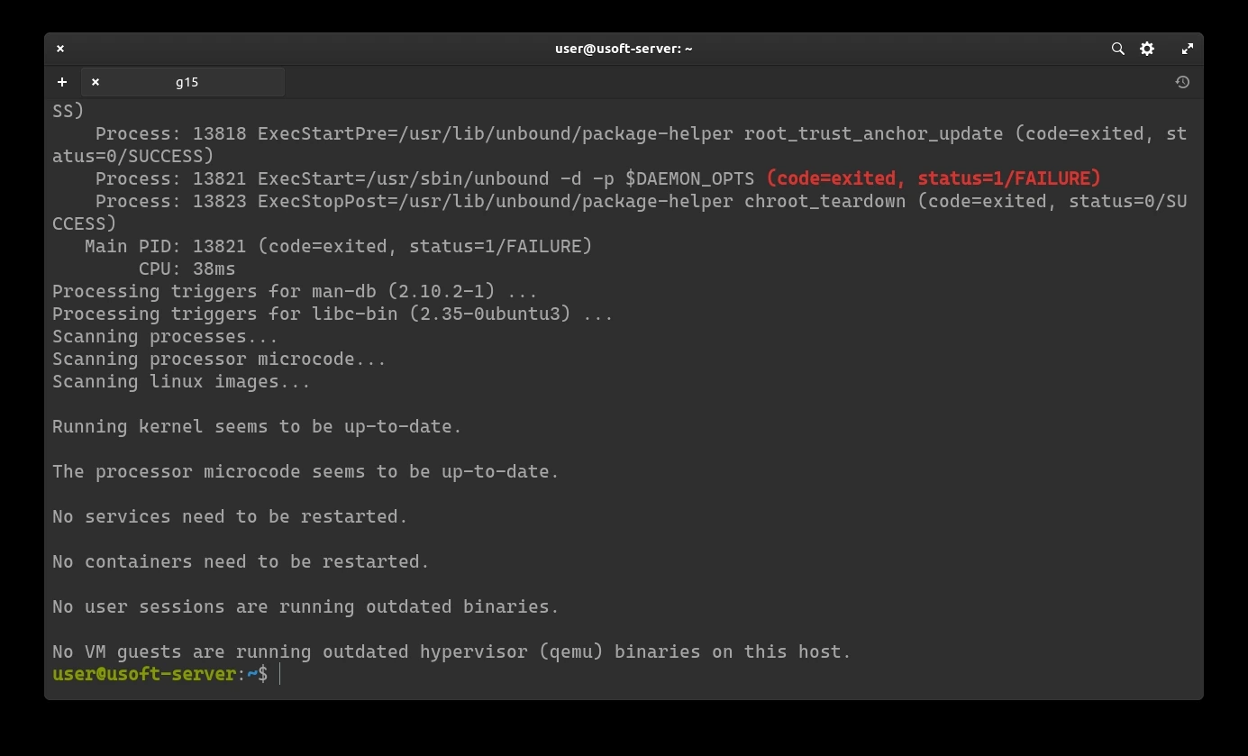 Restart Unbound to load the new configuration: sudo service unbound restart and press Enter. It may request the user password as it is launched with administrator privileges. In case affirmative, enter it and press Enter.