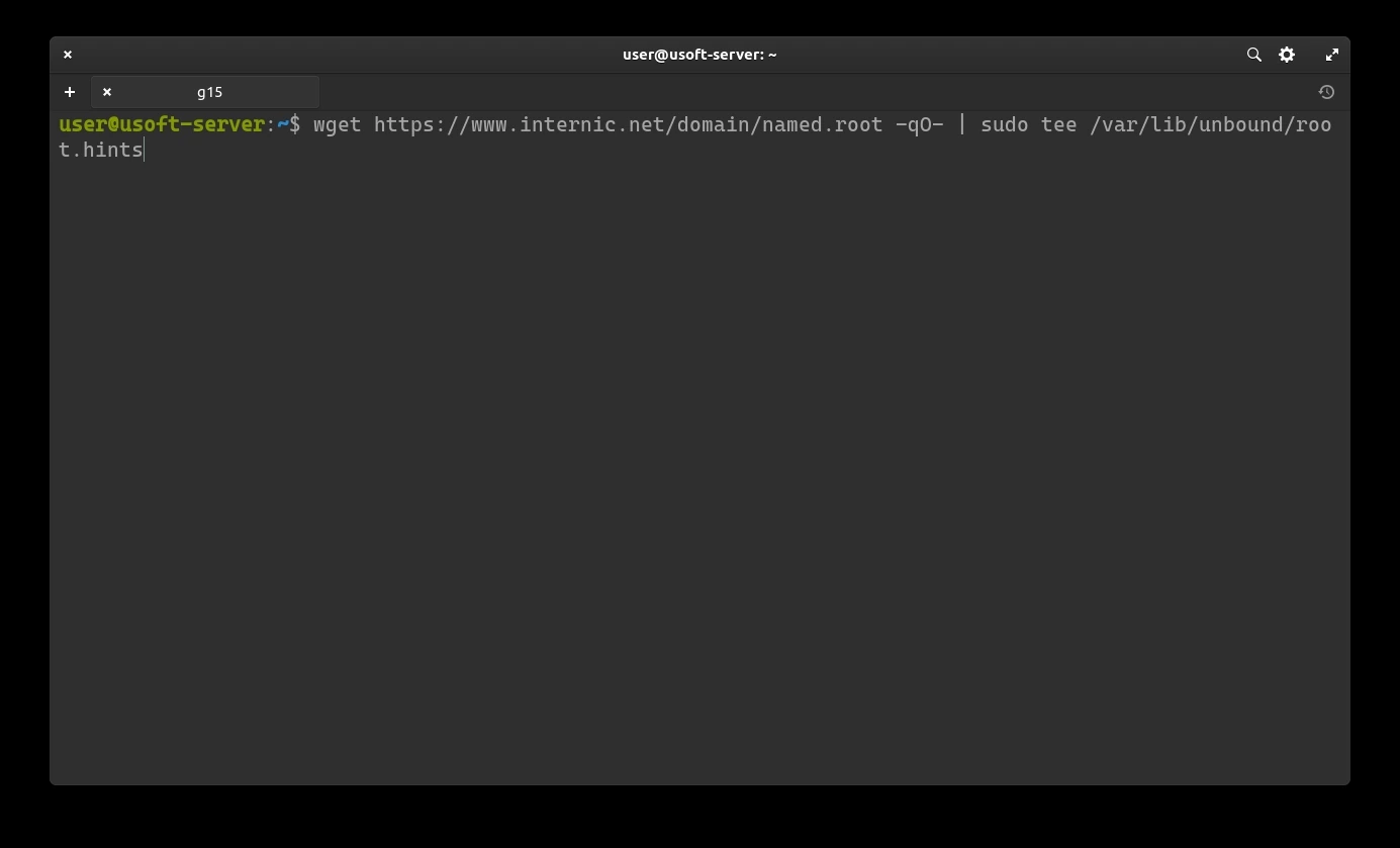 Now it is possible to download the list of IPv4 and IPv6 for resolving the domain registration servers. To do this, use the following string: wget -O root.hints https://www.internic.net/domain/named.root sudo mv root.hints /var/lib/unbound/.