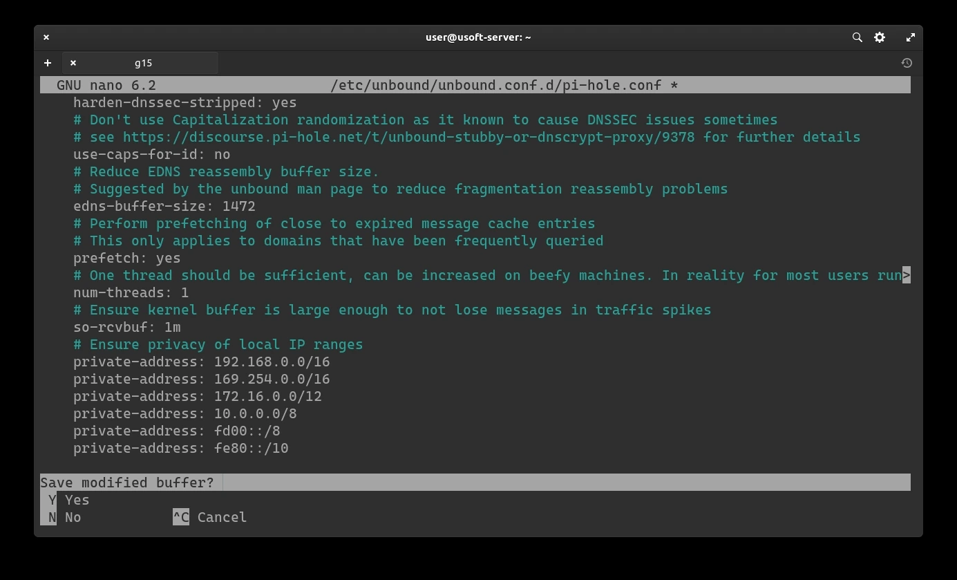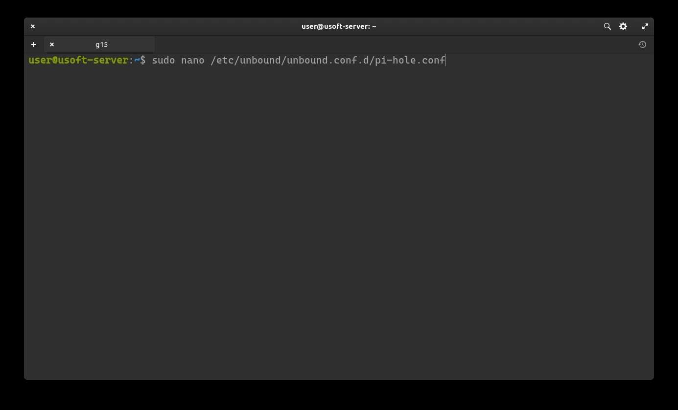 It is necessary to modify the Unbound configuration file. To do this, write the command sudo nano /etc/unbound/unbound.conf.d/pi-hole.conf and confirm with the user password as it is executed with administrator privileges.