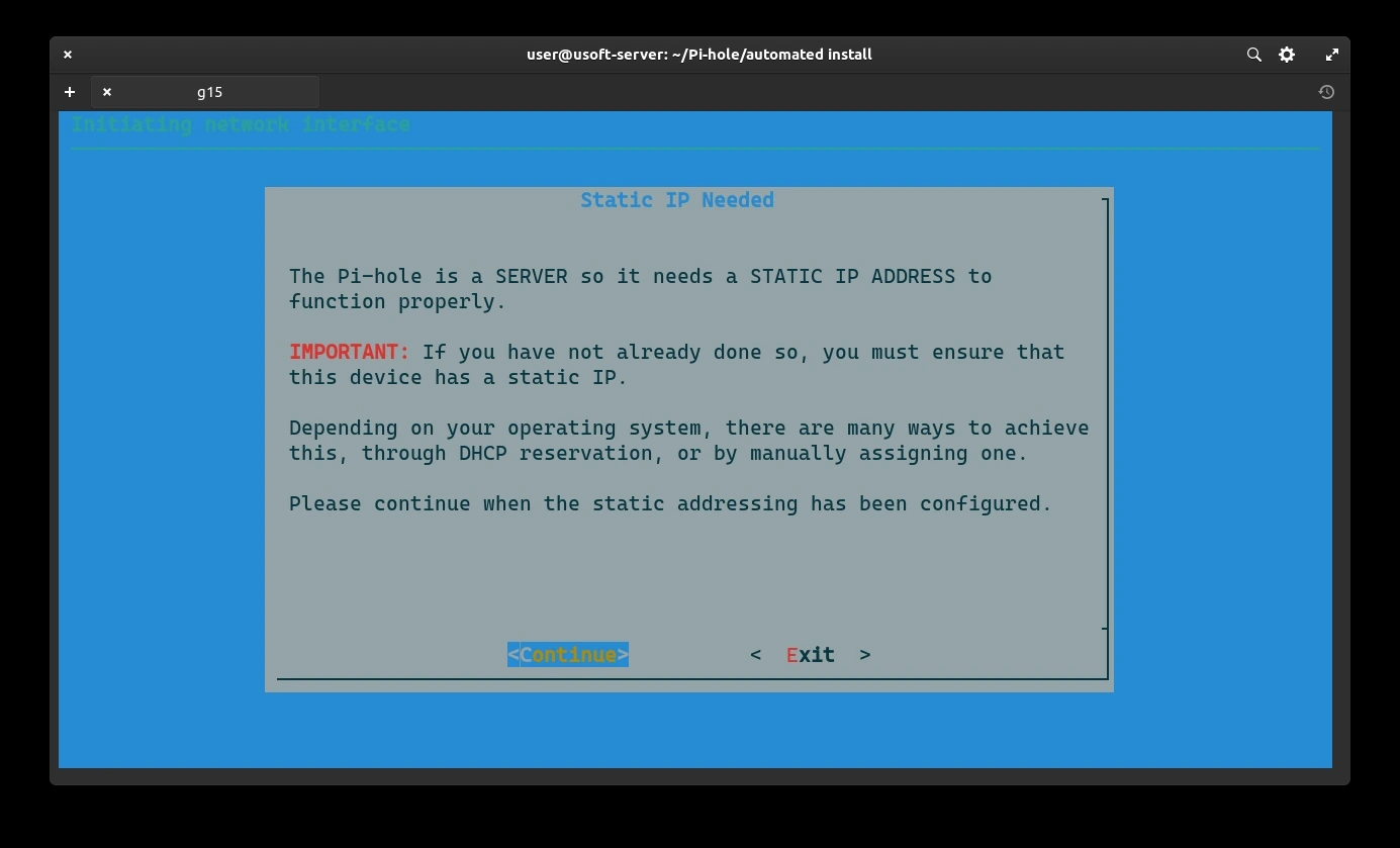 Siccome da router è stato impostato come ip statico possiamo confermare, selezionando Continue e premendo Invio.