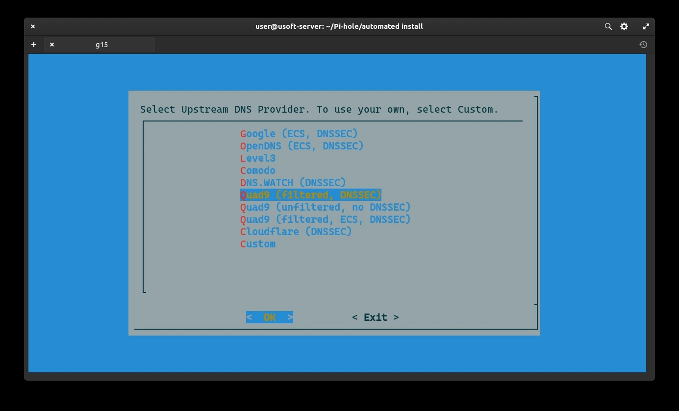 Selezionare un provider DNS provvisorio. Successivamente verrà tolto siccome il computer con Ubuntu Server diventerà un DNS resolver lui stesso alla porta 5353 e indirizzo 127.0.0.1.